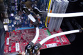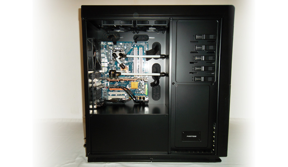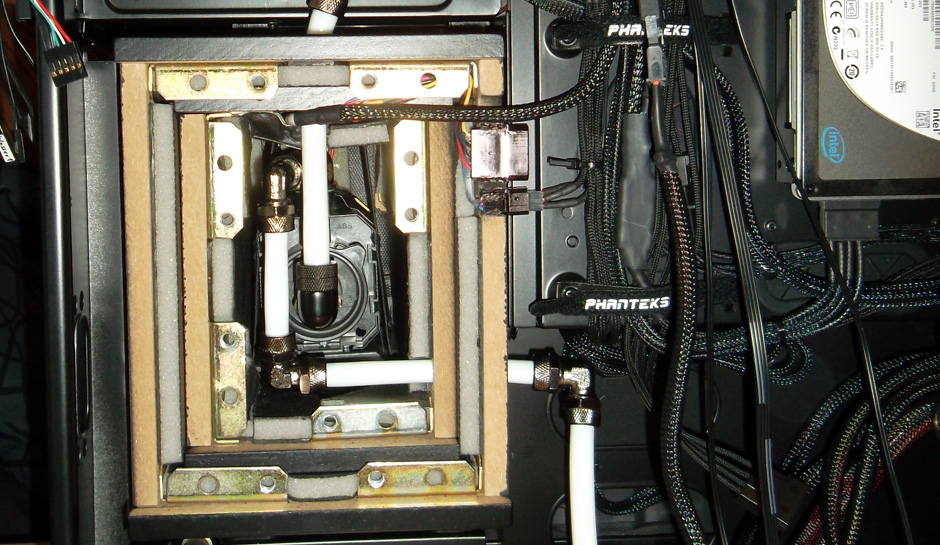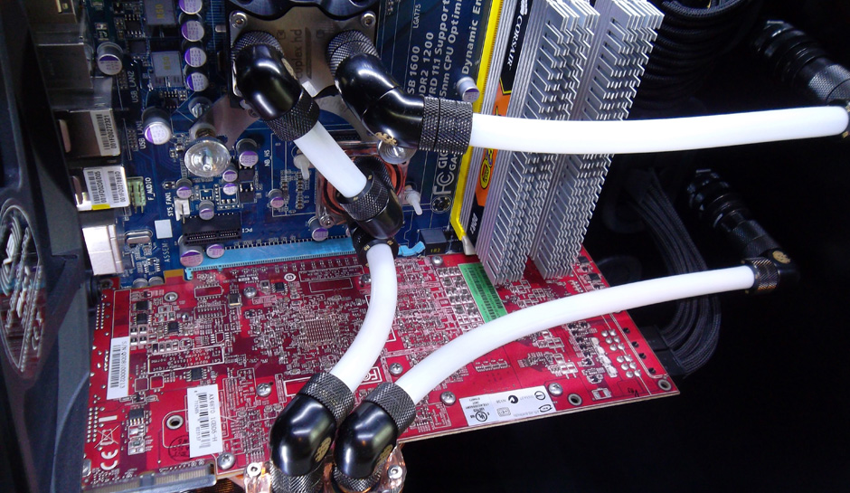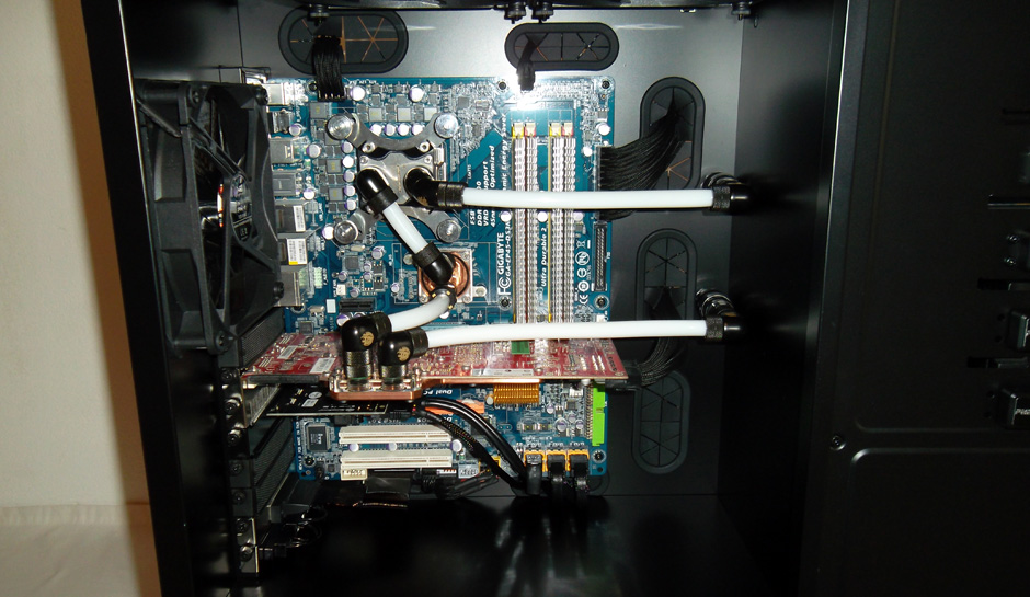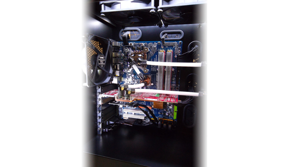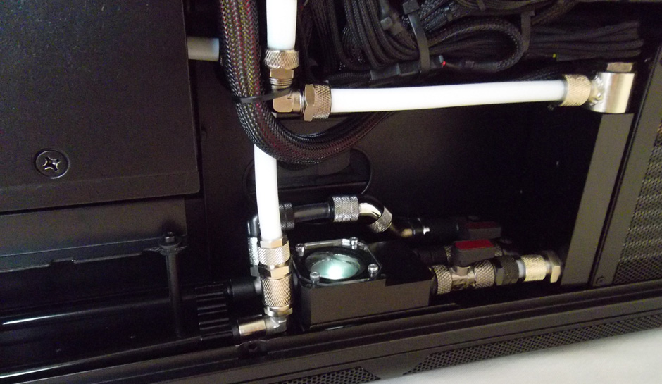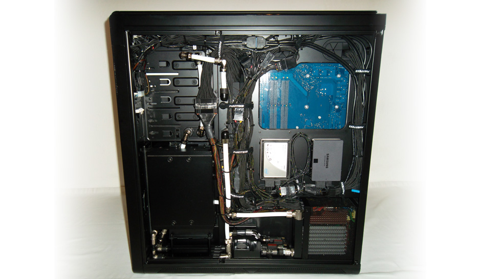 das Wasser der Wasserkühlung und der große Kupfer-Anteil in den Radiatoren. Die Wasserkühlung kühlt die Hardware fast lautlos